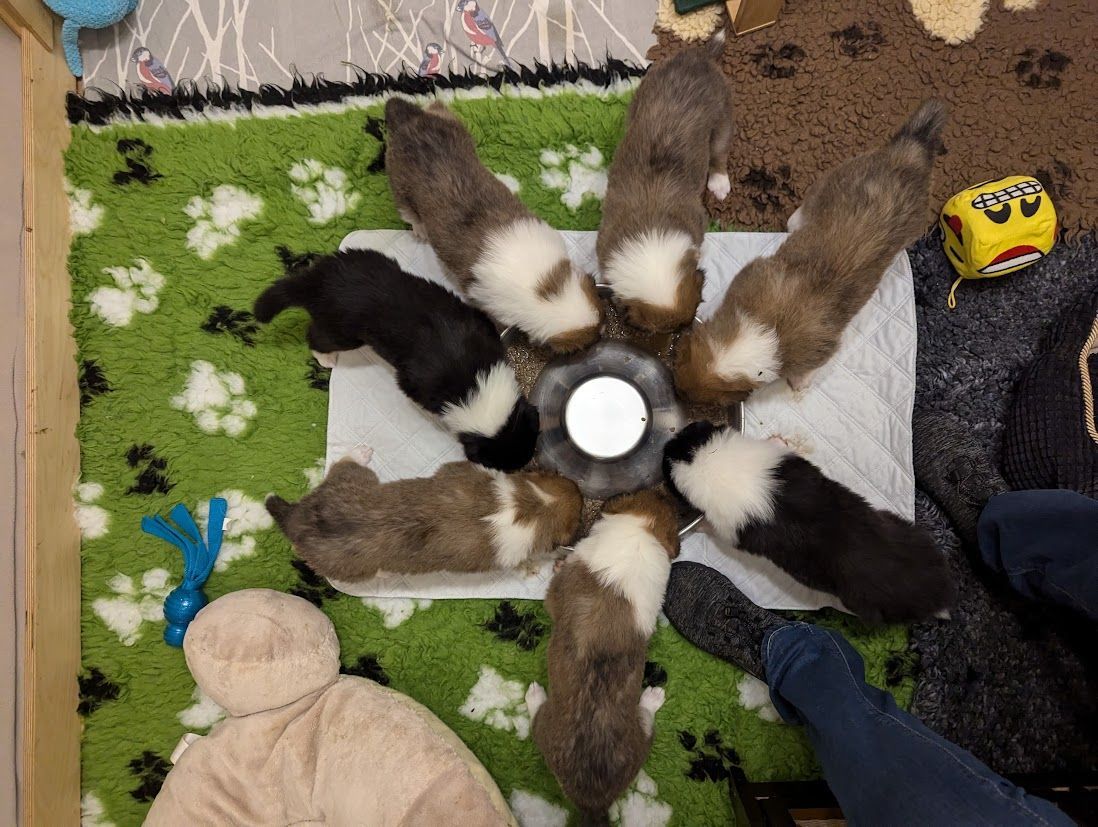 Die Zwergis haben nun auch schon den ein oder andern Besucher kennengelernt, die neugierig begrüßt und beschnuppert wurden. Natürlich sind die Besuche recht kurz gehalten, denn die Kleinen schlafen noch viel. Das Futtern aus dem Ring sieht jetzt auch schon recht manierlich aus, doch am besten ist immer noch Mamas Milchbar🍼. Wir sind mit der Entwicklung unserer Welpen sehr zufrieden, sie toben, sie kämpfen (manchmal etwas lautstark) miteinander, und wärend des Spiels plötzlich fallen alle ins Koma. Wie schon tausendmal geschrieben: einfach herrlich!😍