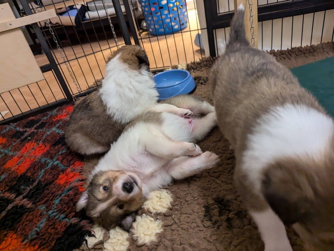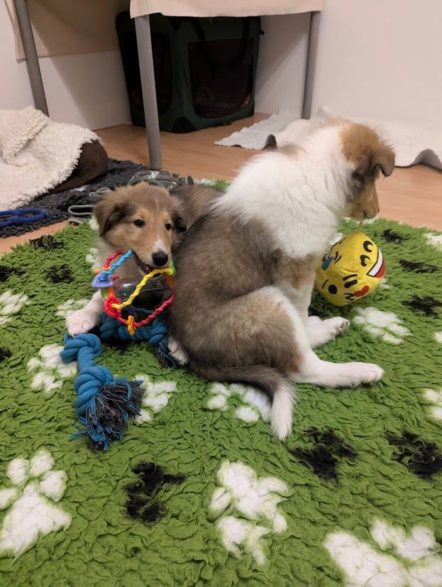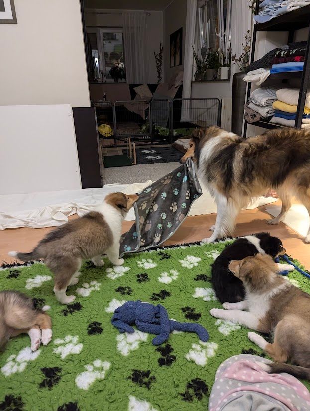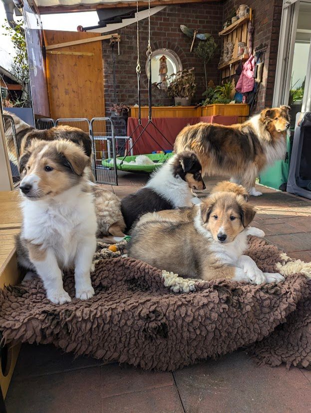 Sie entwickeln sich weiterhin hervorragend, sind mutig, furchtlos, verschmust, und ziemlich neugierig🥰. Inzwischen erkunden sie unsere Welpensichere Terasse und haben auch kleine Ausflüge auf den Rasen unternommen. Leider ist der Boden draußen ziemlich nass, so das der Garten immer nur kurz besucht werden kann, naja hoffen wir mal das sich das Wetter bessert.
