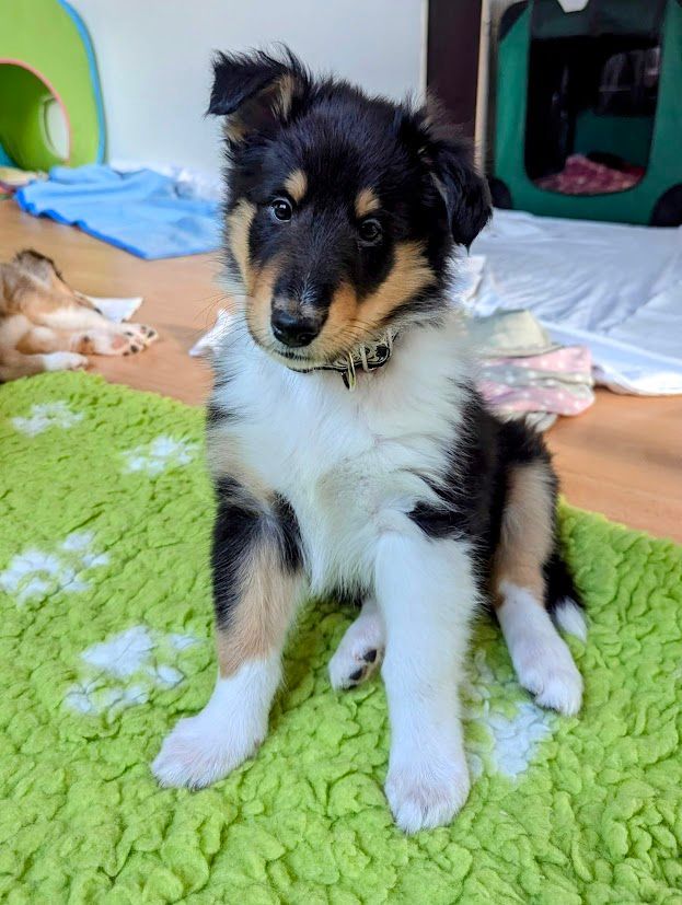 Tjelle hat die weite Reise ins neue Zuhause wunderbar gemeistert. Daheim angekommen, ist er direkt in den Garten, hat alles neugierig untersucht, und sein Geschäft erledigt. Danach gab es Futter, was natürlich gierig verschlungen wurde. Soviel neue Eindrücke machen müde, somit ist er ziemlich schnell und zufrieden in sein Körbchen eingeschlafen.