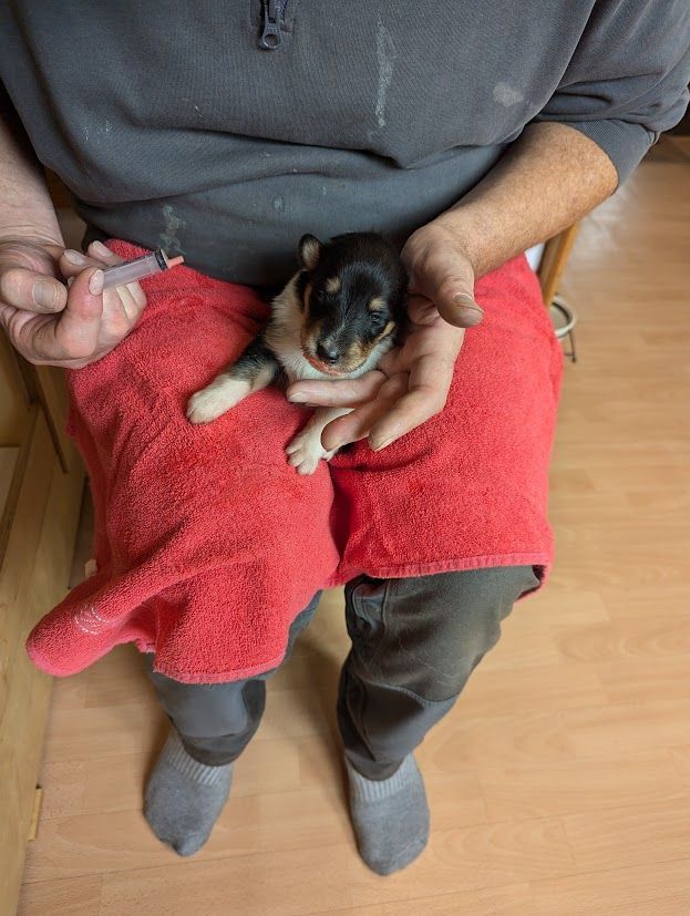 Zu Anfang der 3. Woche gab es die erste Wurmkur, igitt…..🤢,schmeckte den Welpies nicht besonders gut, doch was sein muss muss sein.Vor ein paar Tagen sind wir angefangen Welpenbrei zu füttern, das ist eine herrliche Sauerei🙈, sag ich euch, aber es schmeckt den Zwergen gut, und manierlich essen ….kommt später.