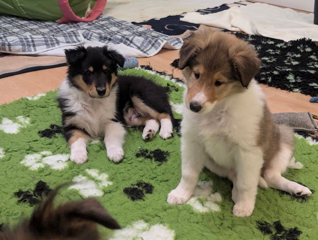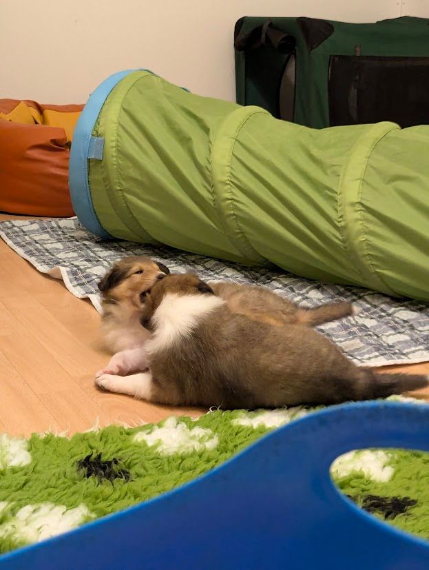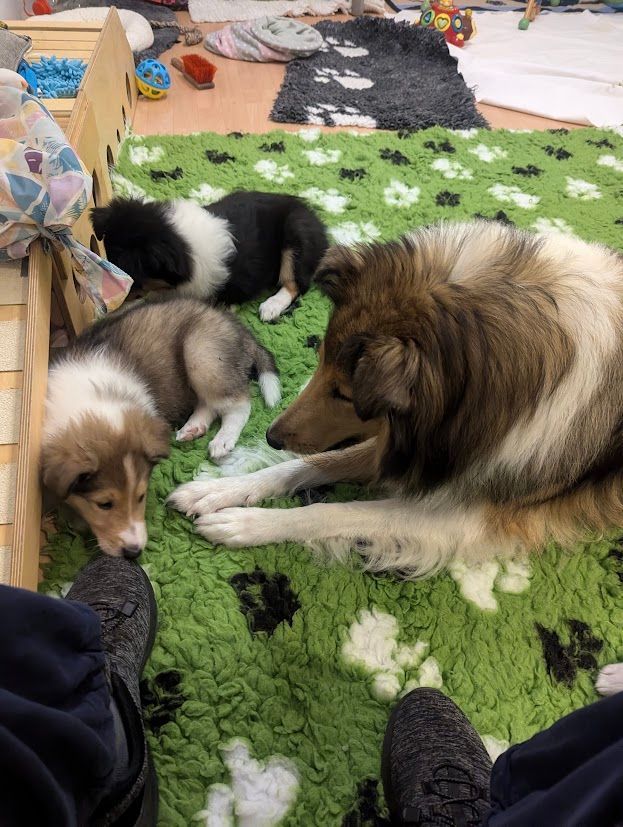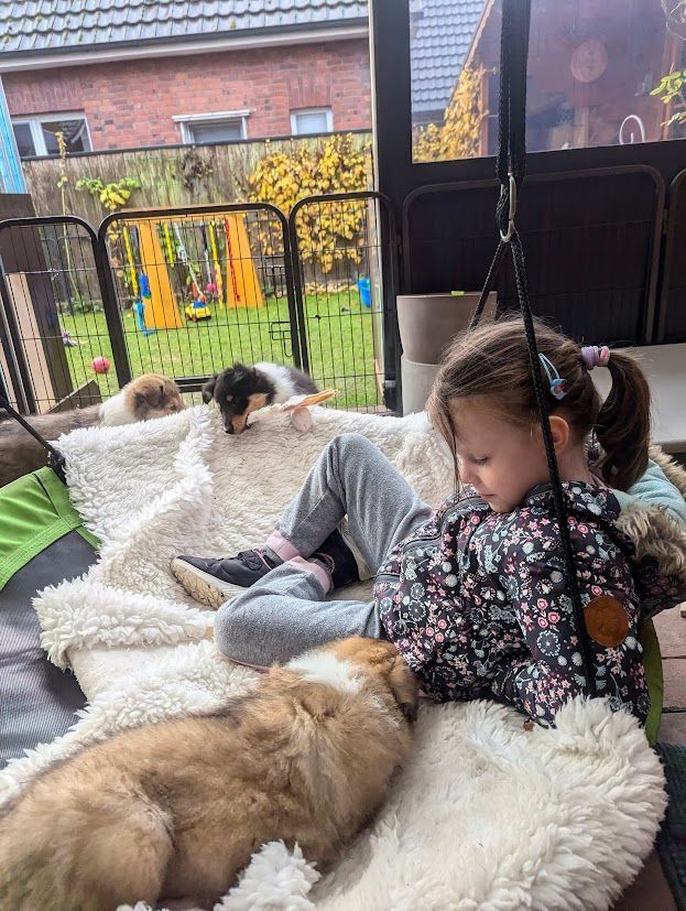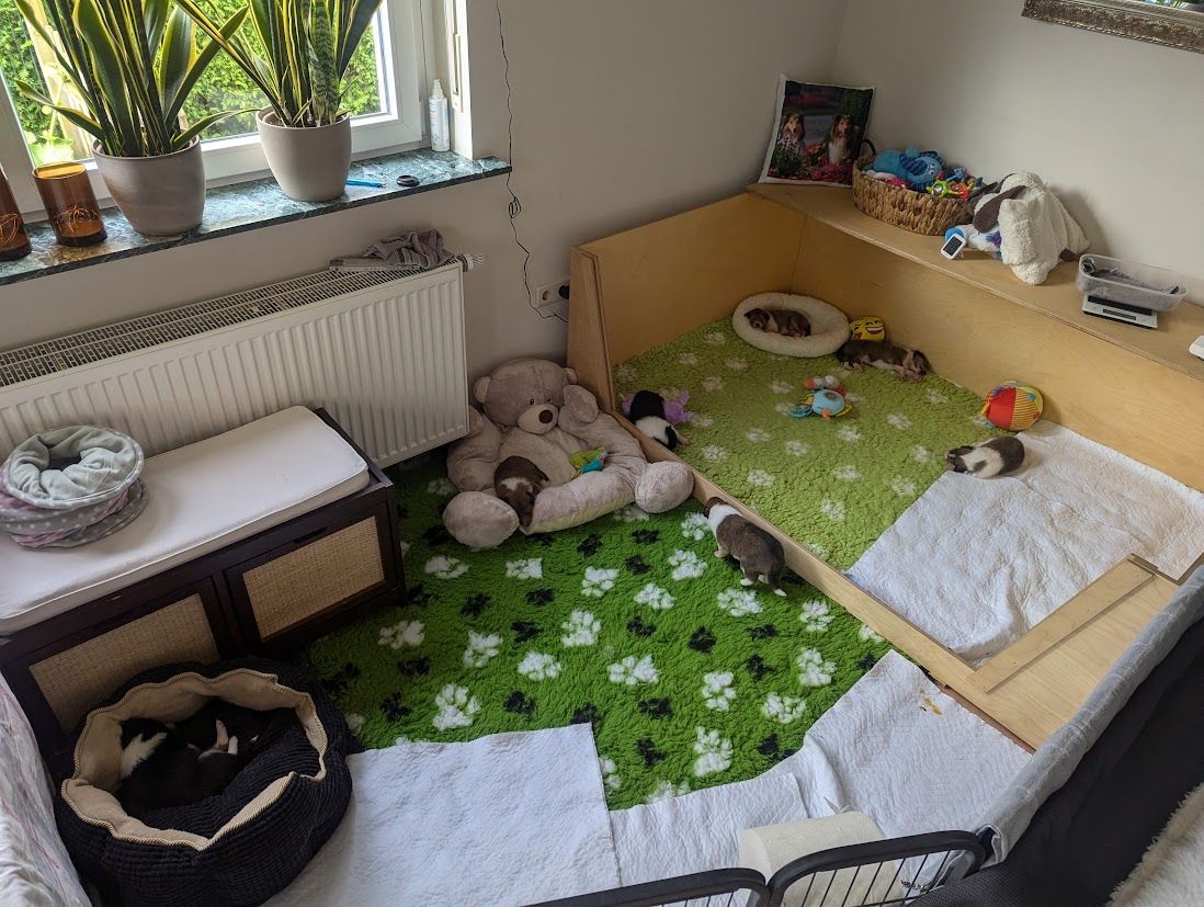 Sie entwickeln sich weiterhin hervorragend, sind mutig, furchtlos, verschmust, und ziemlich neugierig🥰. Inzwischen erkunden sie unsere Welpensichere Terasse und haben auch kleine Ausflüge auf den Rasen unternommen. Leider ist der Boden draußen ziemlich nass, so das der Garten immer nur kurz besucht werden kann, naja hoffen wir mal das sich das Wetter bessert.