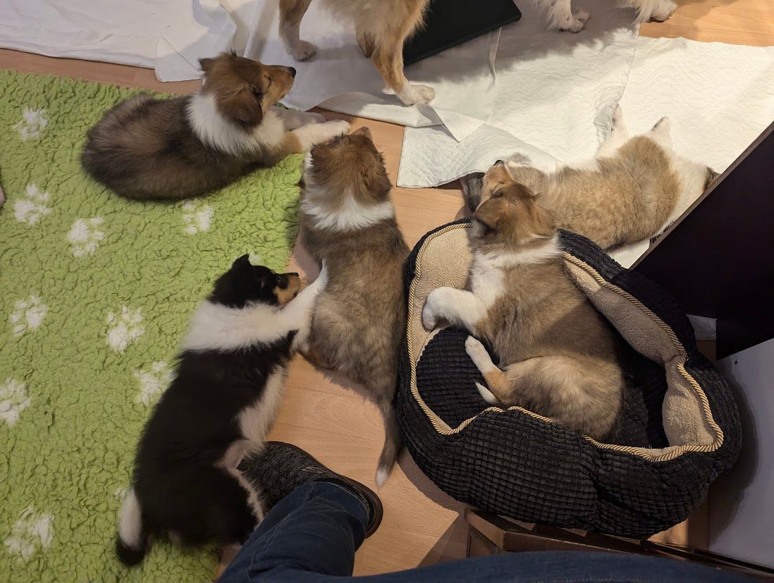 Die Zwergis haben nun auch schon den ein oder andern Besucher kennengelernt, die neugierig begrüßt und beschnuppert wurden. Natürlich sind die Besuche recht kurz gehalten, denn die Kleinen schlafen noch viel. Das Futtern aus dem Ring sieht jetzt auch schon recht manierlich aus, doch am besten ist immer noch Mamas Milchbar🍼. Wir sind mit der Entwicklung unserer Welpen sehr zufrieden, sie toben, sie kämpfen (manchmal etwas lautstark) miteinander, und wärend des Spiels plötzlich fallen alle ins Koma. Wie schon tausendmal geschrieben: einfach herrlich!😍